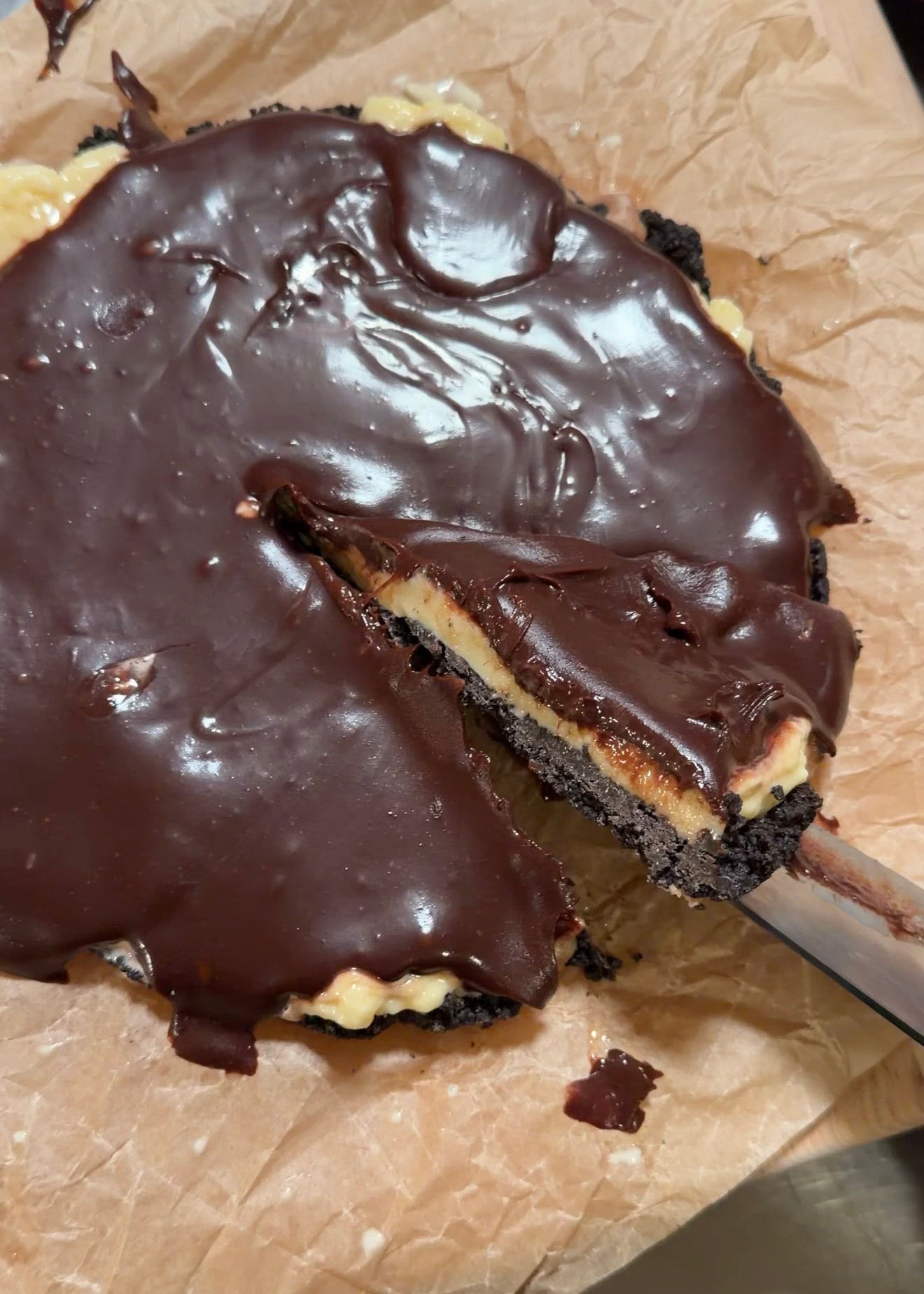 18 classic oreos 2 squares (ounces) unsweetened chocolate 1 tablesp butter 1/2 cup sugar Small can evaporated milk (about 5 oz) 5 tablesp butter (crust portion) 1 quart vanilla ice cream Vegan option: 18 “Back to Nature” Oreo-type cookies 2 squares (ounces) unsweetened chocolate 1 tablesp Earth Balance butter 1/2 cup sugar 1/2 cup Malk vanilla unsweetened almond milk 1/3 cup melted Earth Balance butter 1 quart Oatly vanilla ice cream
