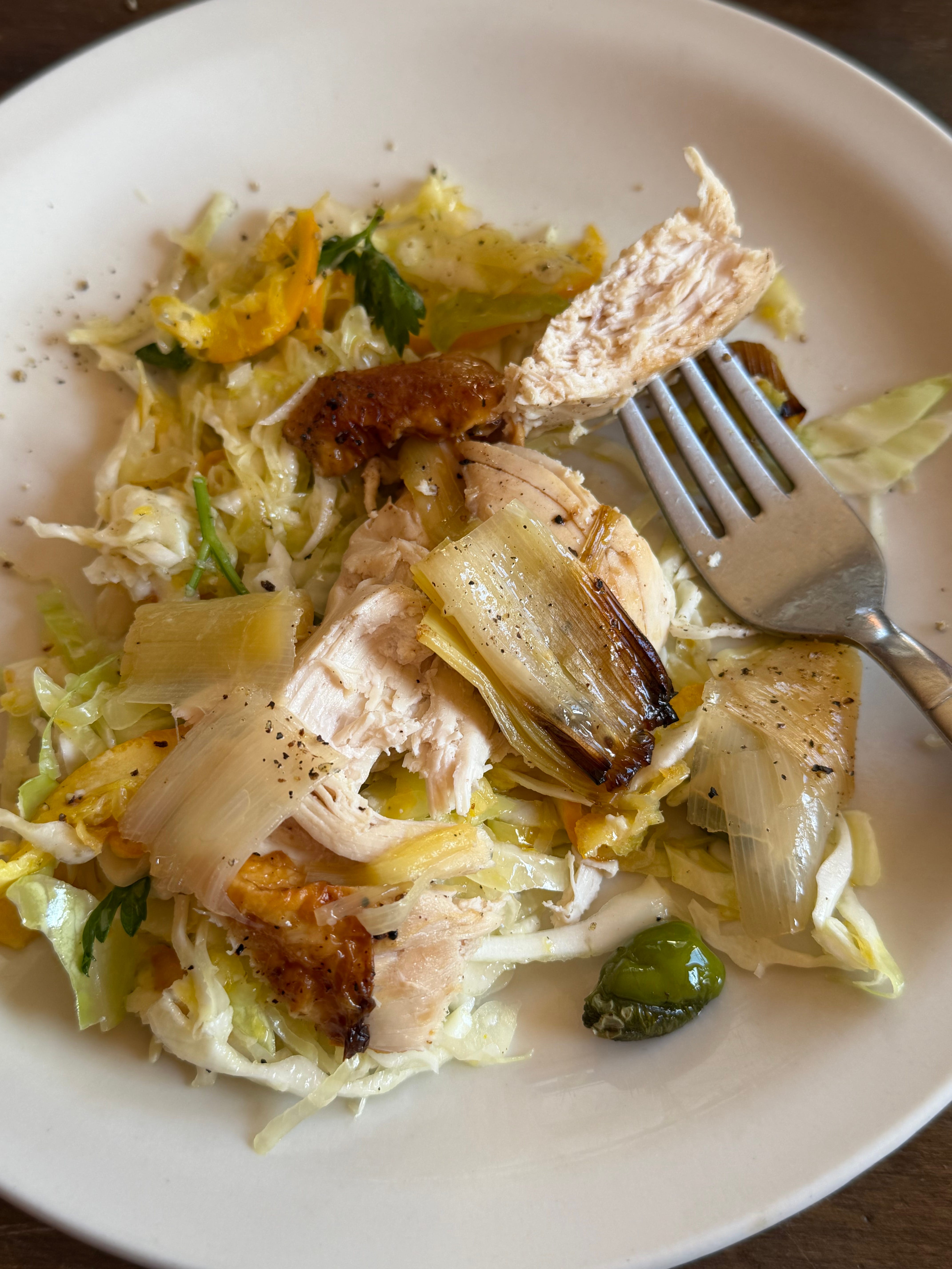 Roasted chicken over citrus and leeks with cooked orange and onion slaw salad with Brightland's Everyday Cooking Oil Brightland Everyday Cooking Oil is a pantry staple for me with its quality of taste and cooking ability. I reach for this for everything - whether I’m roasting, sautéing, or prepping ingredients to go on the stove or in the oven. It has a clean, balanced flavor that lets the food shine while still tasting really good. Slice three oranges and one lemon into quarters and display on the bottom of a 9x13 in a baking pan. Trim and wash three leeks and slice into small cylinder pieces, and cut in half again. Add to the pan. Rinse and dry a 3 lb chicken, and place over your citrus and vegetables, layer on 6 tbsp salted butter cut into individual pieces, and as many castelvetrano olives as you’d like. Douse everything thoroughly with Brightland Everyday Cooking Oil - from roasting to dressing to finishing, this is a pantry staple for me with its quality of taste, and cooking ability. Season with lots of salt and freshly cracked pepper. Bake in a 425 degree oven until the internal temperature is 170, an hour roughly. For your salad, slice thin one navel orange, one small onion, and 1/2 head cabbage. Heat a large pan and add 2 tablespoons of butter, and lots of Brightland Cooking Oil. Sauté orange and onion until caramelized, tender, and fragrant. Place cabbage in a large bowl and layer cooked orange and onion. Add flat leaf parsley, and tons of freshly grated parmesan cheese. Douse in Brightland everyday Salad oil for your dressing, and season with salt and freshly cracked pepper. This gets better with age!!! To plate, top slaw with chicken, its juice, and the cooked leeks and olives. Best bites!