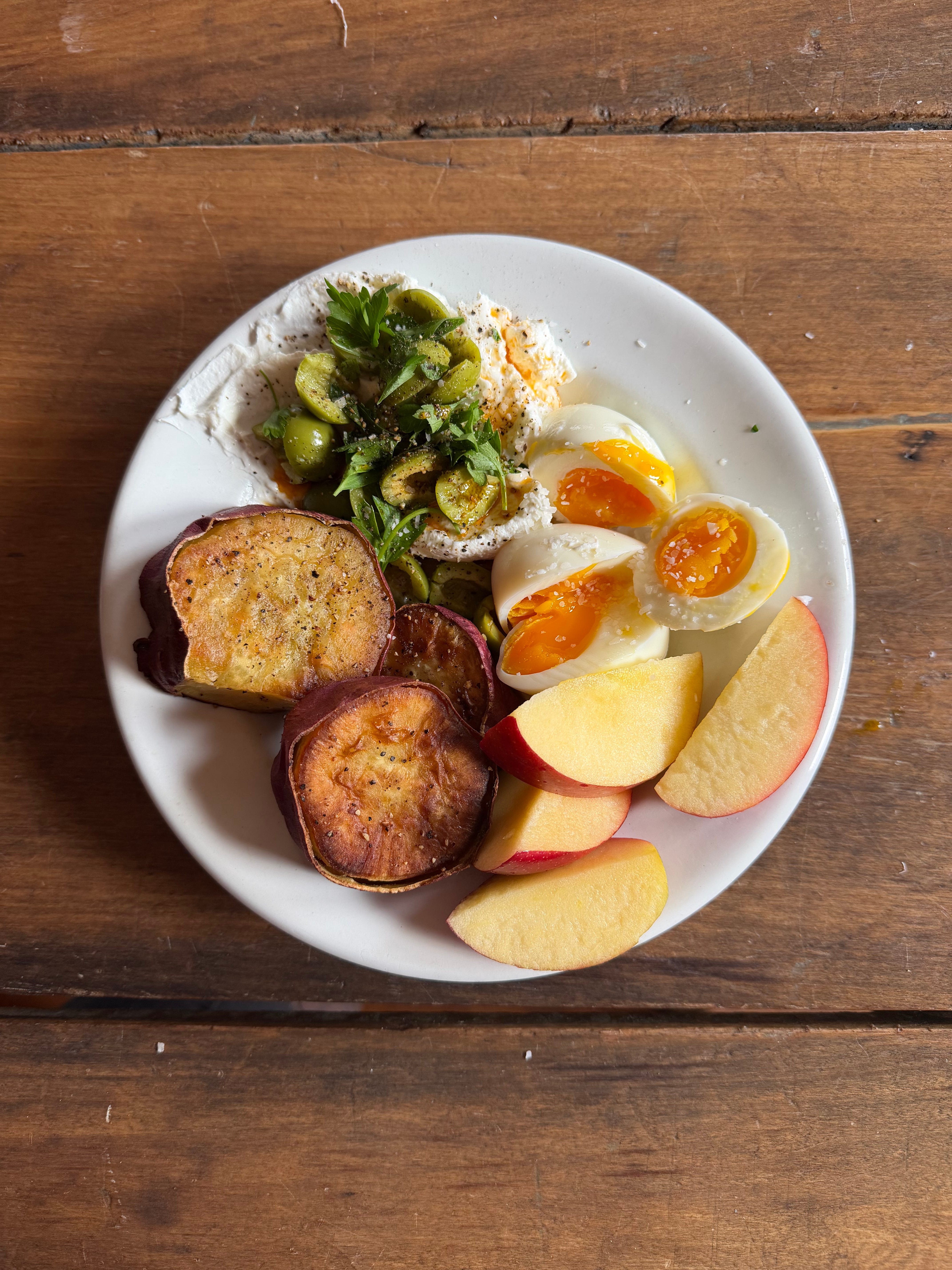 Lunch plate Plain yogurt with castelvetrano olives, chili oil, parsley, salt, and pepper, two farm fresh jammy eggs, roasted Japanese sweet potato, sugar bee apple. Potato - slice into large chunks or coins and coat in olive oil, nice salt, freshly cracked pepper. Bake in a 475 degree oven for 25 minutes. Flip and bake for another 5 or so, or until perfectly golden and caramelized. I prefer them almost burnt. Jammy eggs - bring small pot of salted water to a boil and lower in eggs with a slotted spoon. Set timer for seven minutes, reduce heat slightly. Remove eggs and place into an ice bath or under cold running water to peel. FYI the yogurt / olive / chili bite with potato is really perfect.