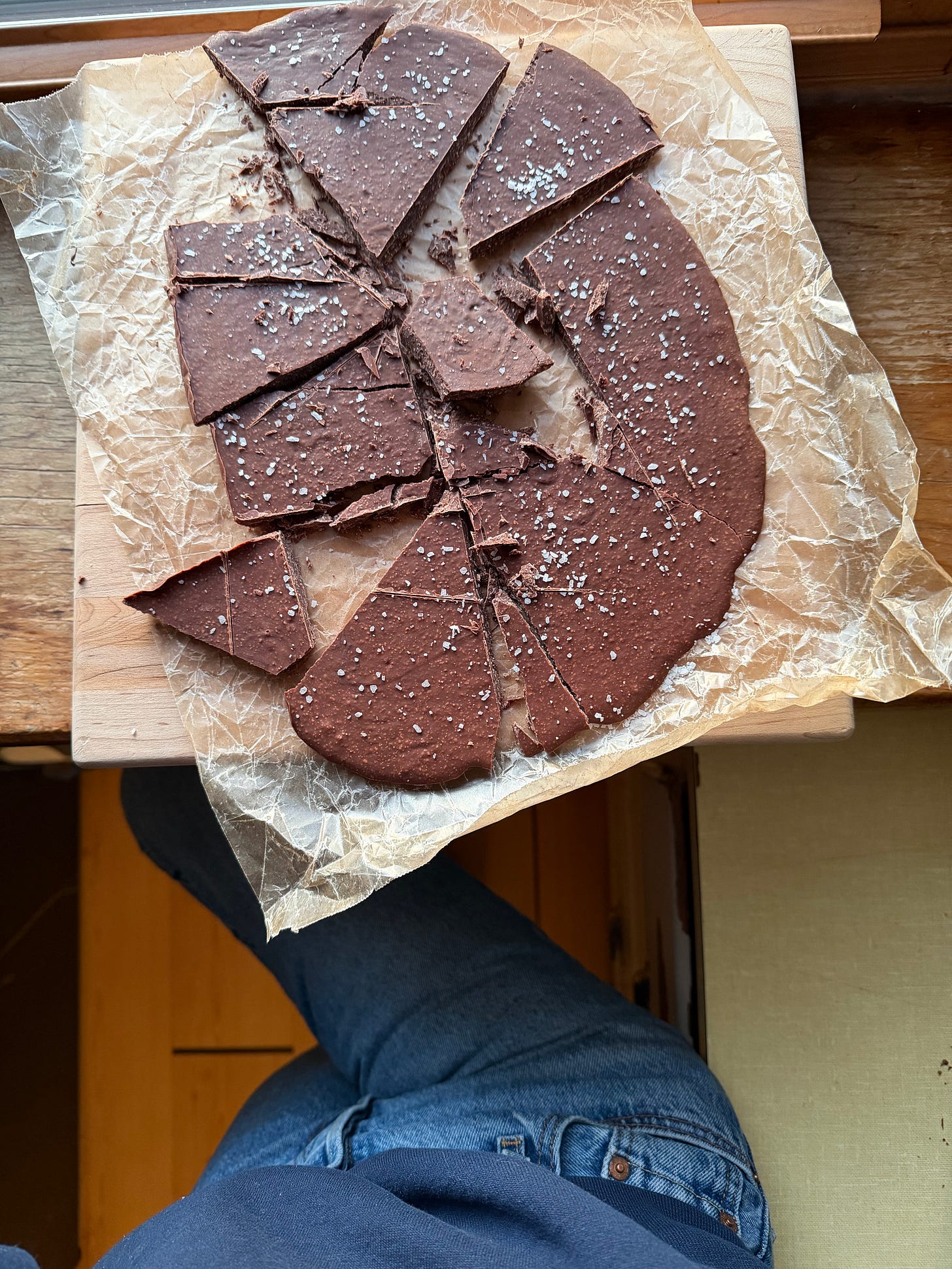 One bag unsweetened coconut flakes blended into coconut butter, mixed with one bag semi-sweet chocolate chips melted, makes a delightfully gritty textured, melt in your mouth homemade chocolate bar. Transfer mixture onto a parchment lined pan and freeze until hardened. Remove and top with flaky salt. Chop. Store in airtight container in the fridge.