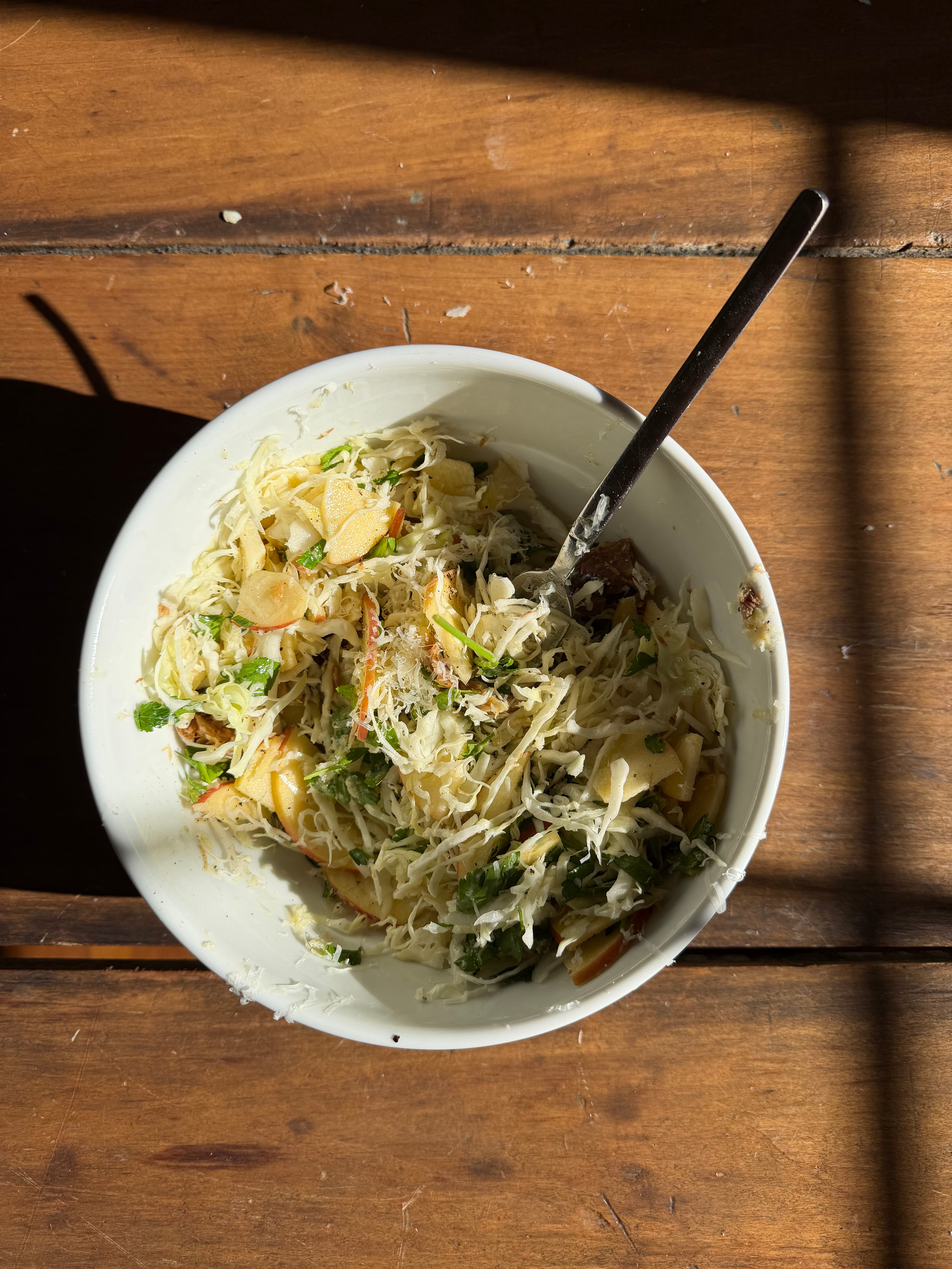 Shred 1/4 cabbage and layer on one sugar bee apple thinly sliced, a handful of flat leaf parsley chopped, one tin mackerel, and tons of grated Parmesan and freshly cracked pepper. Pinch of salt, a few pours of olive oil, and champagne vinegar for dressing. Sweet, savory, juicy, crunchy.