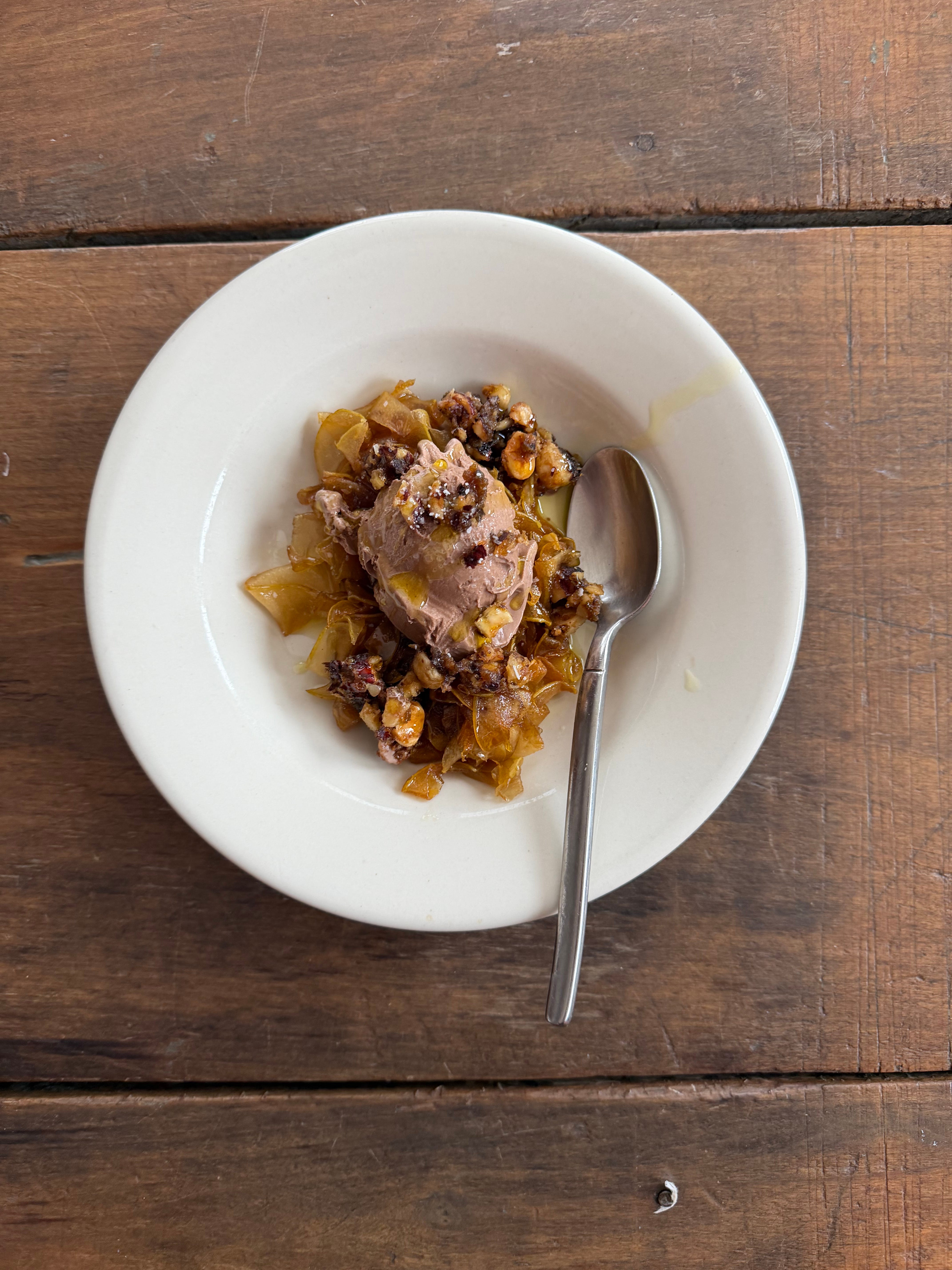 Thinly sliced pear cooked in a tablespoon of butter, a bit of olive oil, brown sugar, and a pinch salt. Sauté until you have tender caramelized ribbons. Scoop vanilla or chocolate ice cream over pears and top with toasted hazelnuts (or my hazelnut topping), and a drizzle of olive oil.
