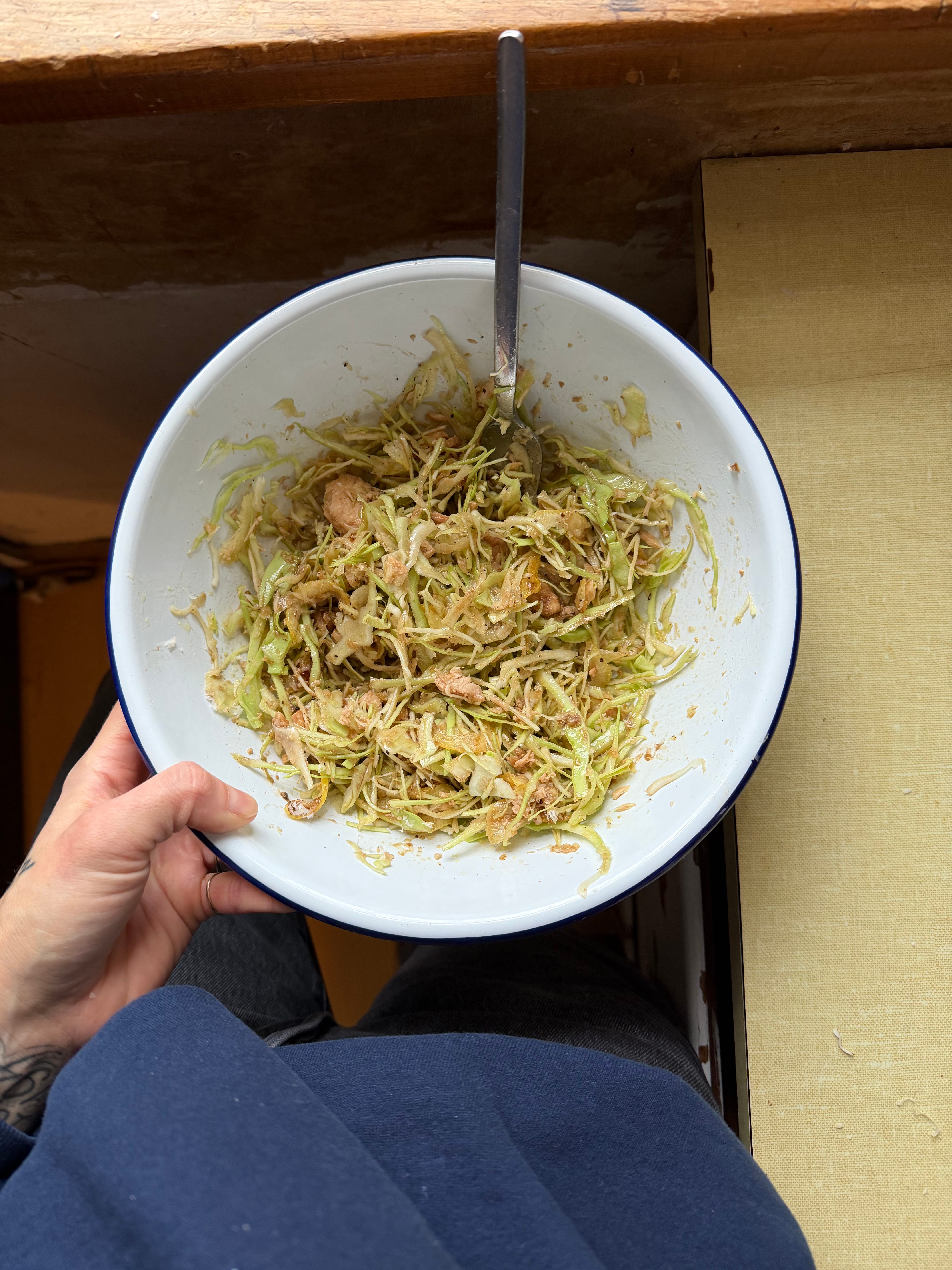 Cut one head cabbage into quarters and slice very thin. Add desired amount to a big bowl and add one whole cooked lemon, sautéed in nice olive oil until tender and slightly browned or caramelized. The less you cook the lemon, the more bitter it will be. I love the juicy bright bite! Add one can nice tuna, lots of Parmesan cheese, salt, freshly cracked pepper, and olive oil and balsamic vinegar until salad is properly dressed to your liking.