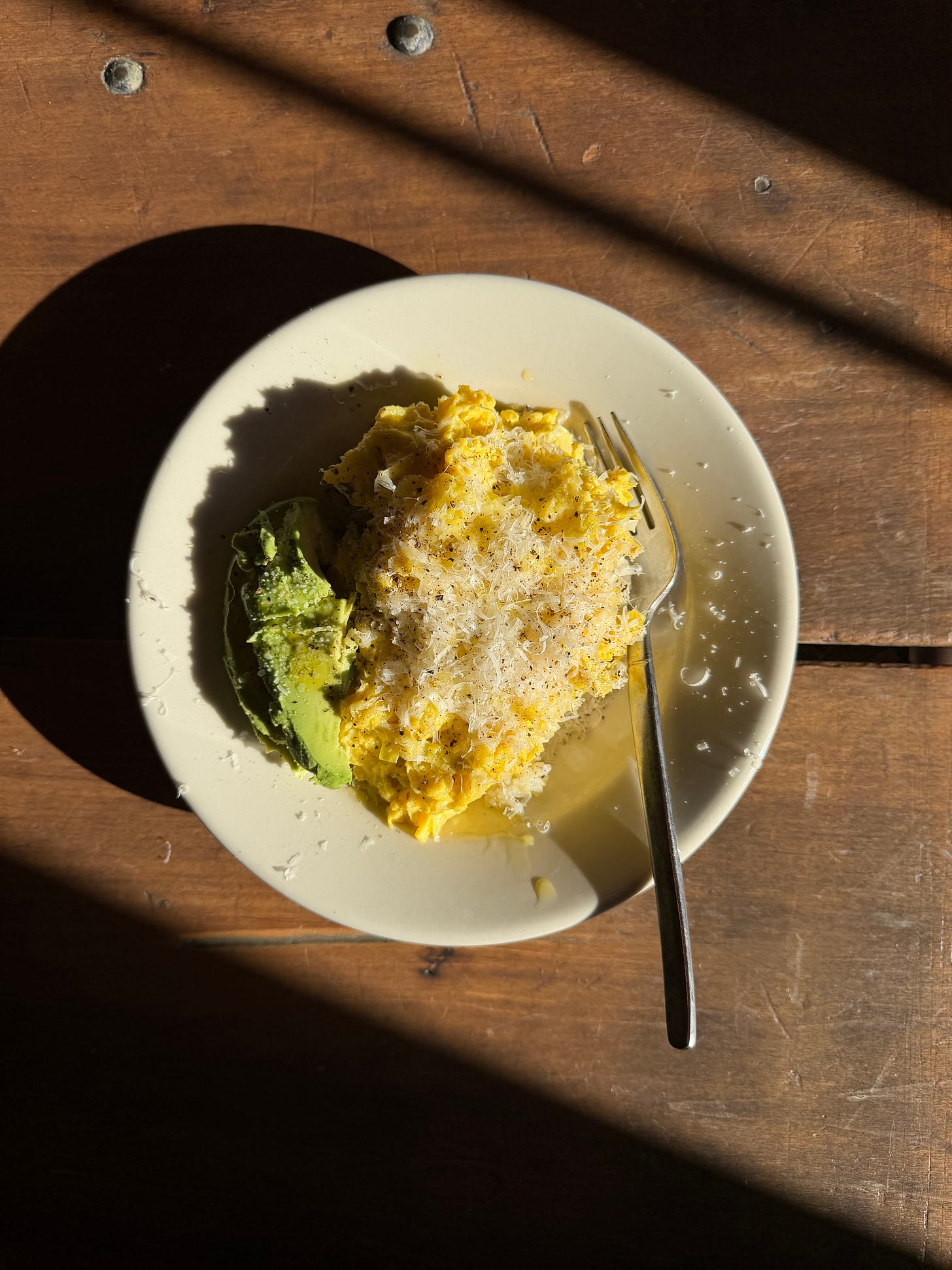 Wash rice and cook desired amount - I bring it to a boil with a bit of olive oil and salt, reduce heat to low and cover for ten minutes. Slice and wash one leek into bite sized pieces. Slice thin one whole lemon. Cook down lemon and leek together in a hot pan with olive oil and a tablespoon of butter until tender, fragrant, and translucent / caramelized. Add three beaten eggs and season with salt and pepper. Plate rice and scramble and top with lots of parm, freshly cracked pepper, and olive oil. I added avocado. This is so perfect for a cold day.