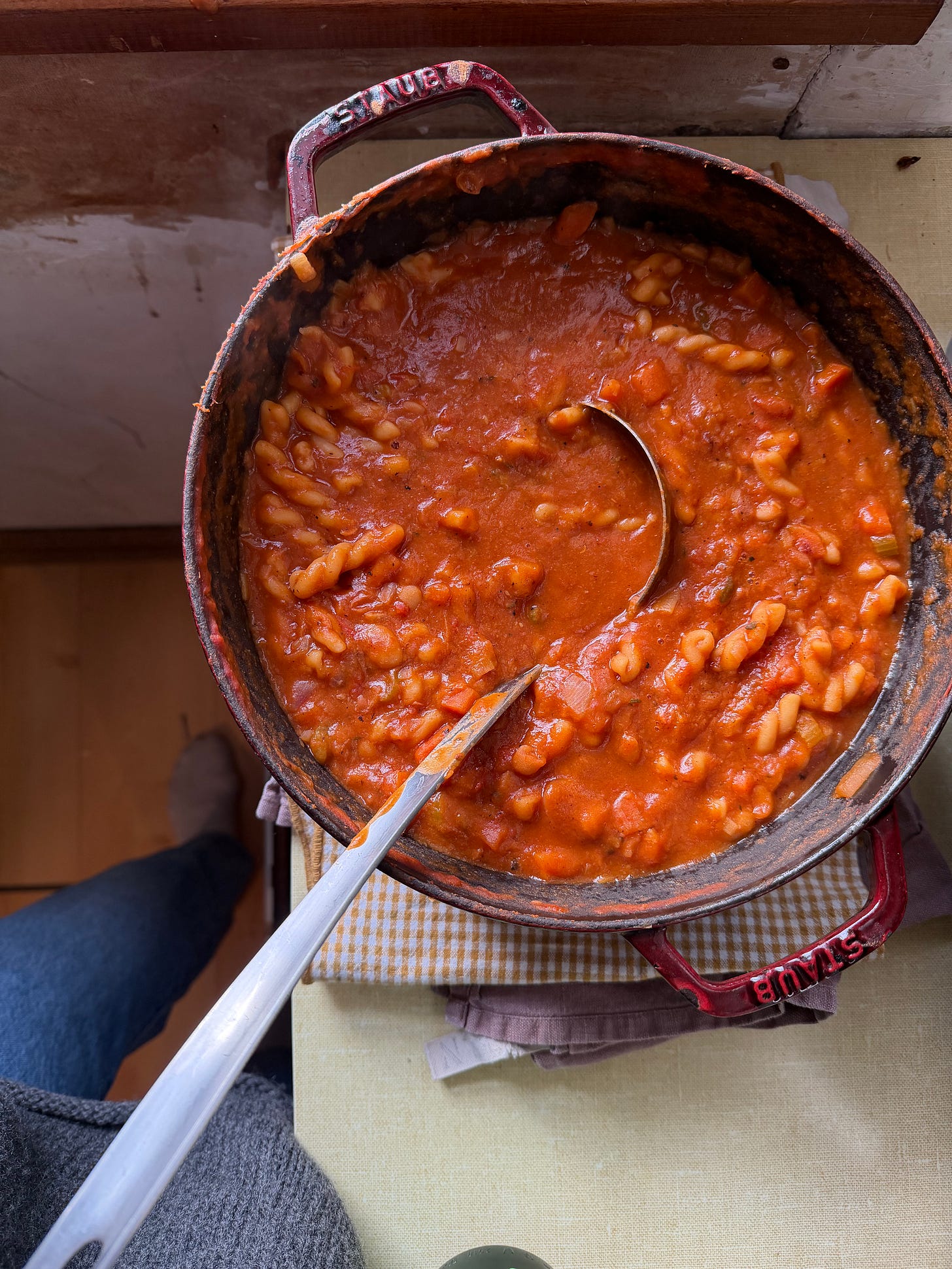 1 leek chopped into bite sized pieces 5 carrots diced 5 celery ribs sliced into bite sized pieces 1 red onion diced Few cloves garlic chopped or minced 6 oz tomato paste 30 oz crushed tomatoes Parmesan rind 32 oz veg or broth of choice + more to thin 1 package nice pasta 3 can northern beans drained and rinsed Tons of fresh oregano and thyme Salt, fresh cracked pepper, and paprika to taste