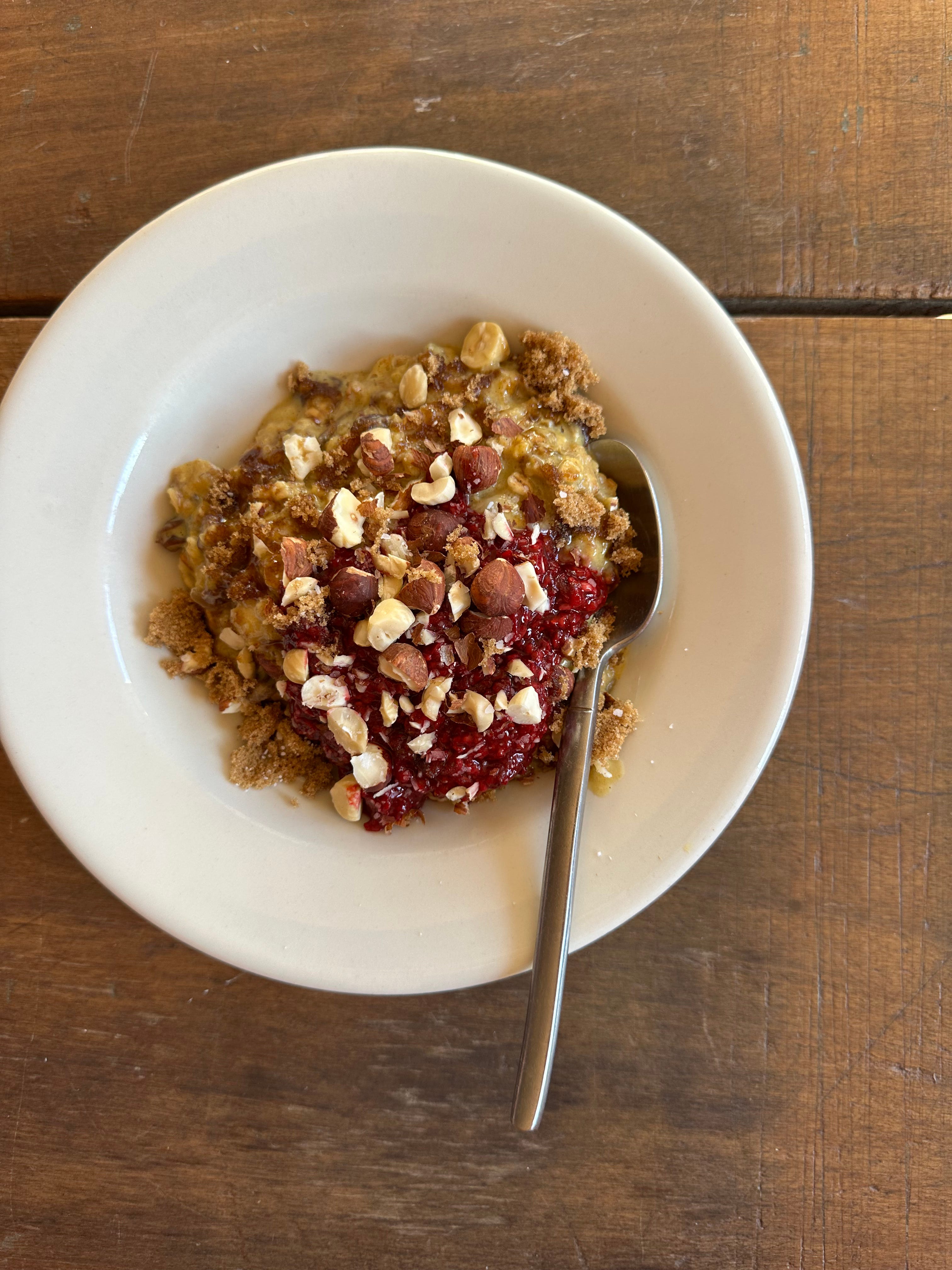 In a small pot, combine equal parts muesli and milk. Add a few medjool dates pitted and torn apart. Pour a splash more milk to thin if needed. Simmer with vanilla, and a pinch salt. Add 1 egg and 1 egg yolk last, allowing the heat to cook the eggs. While that cooks, add about 1 c frozen raspberries with juice from 1/2 lemon in a small pan for your compote. Simmer until combined / jam like. Top muesli with raspberries, and cover in chopped hazelnuts, brown sugar, pinch salt.